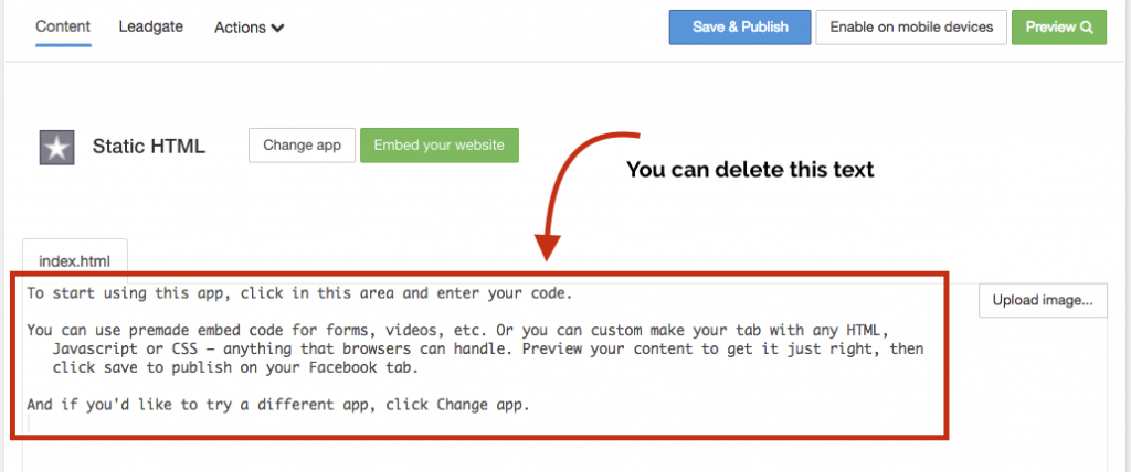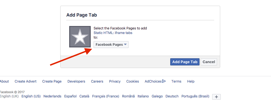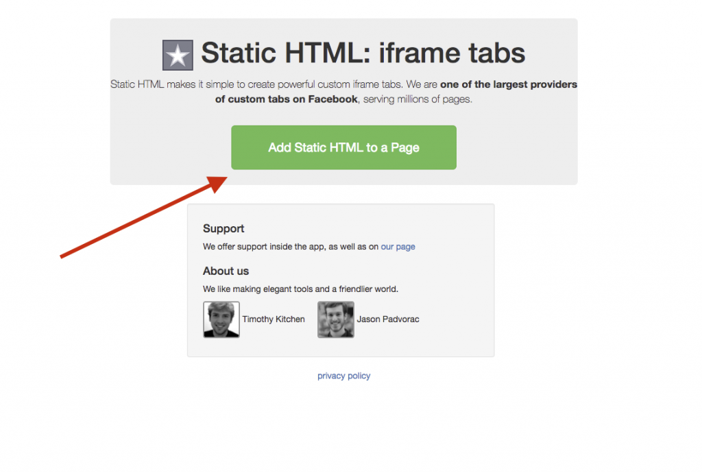 Make sure you are logged in to your Facebook account which is associated with the page that you want your virtual tour on. Then go to this link (https://apps.facebook.com/static_html_plus/) and click “Add Static HTML to a page.”