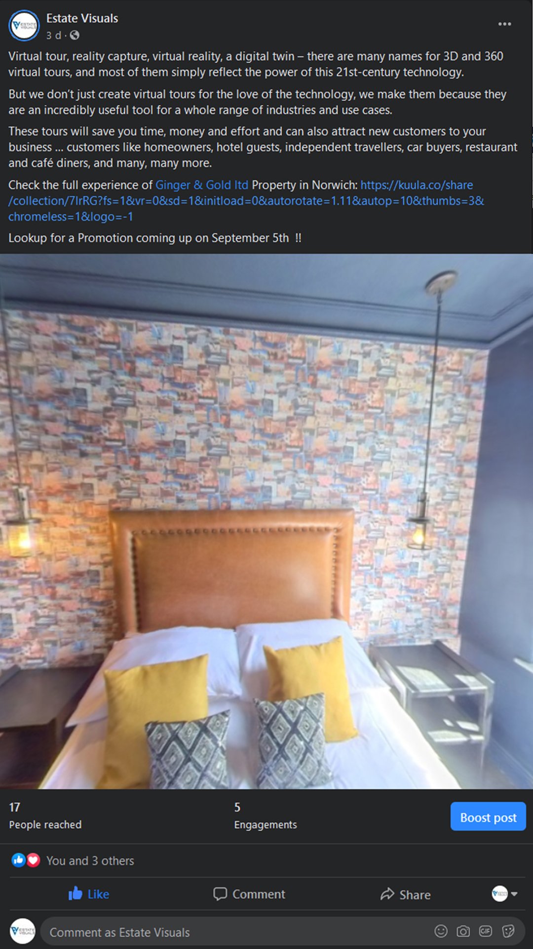 Amazingly, Facebook supports 360° media. It can be photos and videos. So make sure to use this platform to share some of the 360° photographs from the virtual tour.
